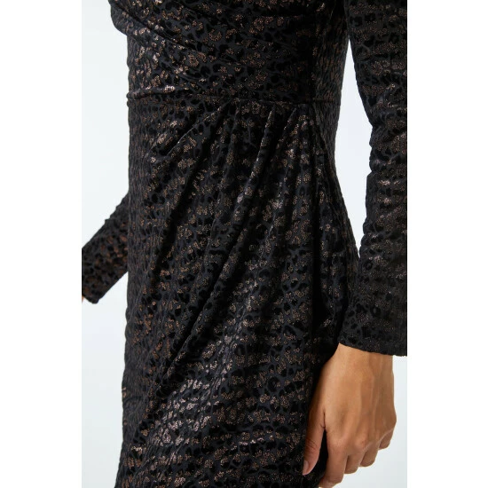 Dance the night away in this animal print burnout wrap dress. With an all over velvet to the touch fabric, finished with a copper shimmer burnout print complimenting the overall look. Topped off with a flattering wrap over bodice, long sleeves finishing at a demure knee-length, this dress is the ultimate go getter dress, paired with simple jewellery and heels ready for your next night out event!
