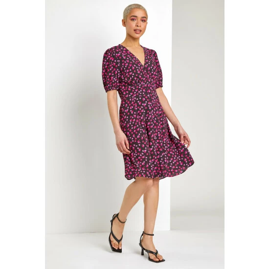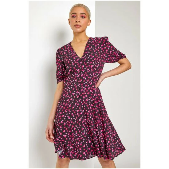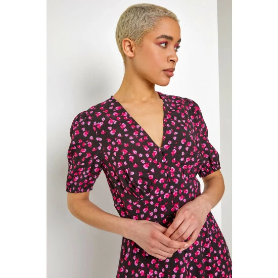 Upgrading your wardrobe has never been easier with a timeless silhouette in this floral tea dress. Gathered under bust with fully functional buttons down the centre front, this elasticated cuff number has short puff sleeves and a delicate frill to the hemline. Finish your look with heeled boots and a faux leather jacket for a biker-babe style or alternately keep it casual with trainers and denim jacket.