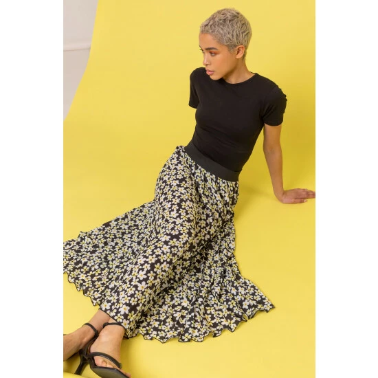 Embrace this season’s printed crush with this pretty pleated skirt. Featuring an elasticated waist, this spot printed skirt will add dimension to any outfit. This playful pleat trend is perfectly paired with a simple t-shirt or cami for a quick on the go yet stylish look. Worn with trainers to heels, this maxi skirt is versatile in style and adaptable for a multitude of occasions.