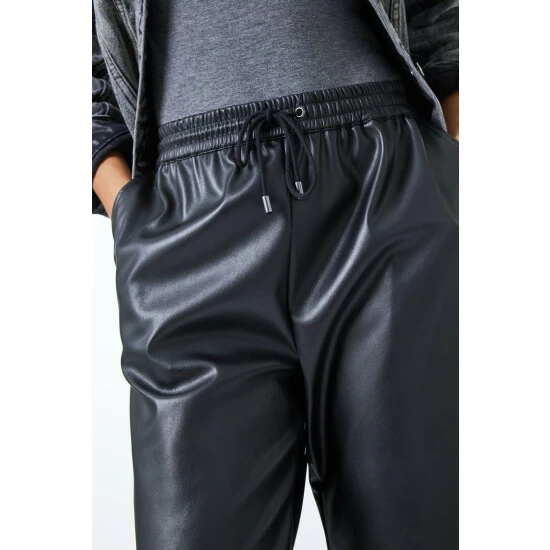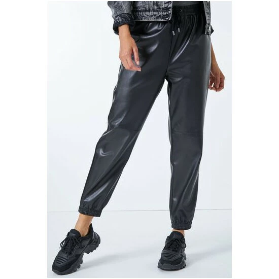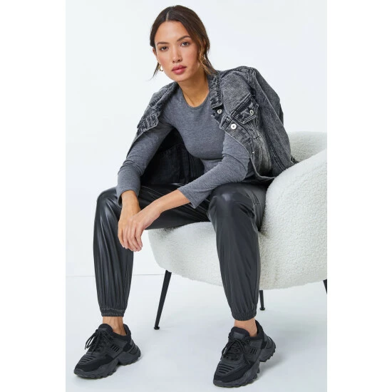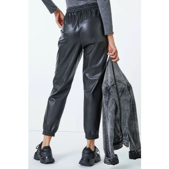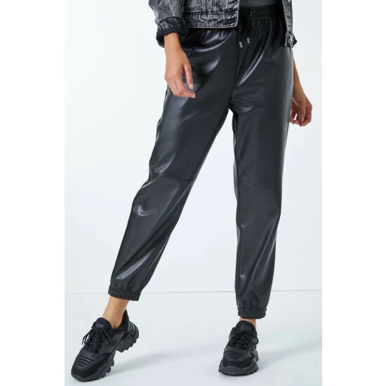 Joggers but make it fashion! These sports luxe, leather look jogging pants are right on trend. Comfort is key with their elasticated cuffs and waistband. Notable details include a drawstring tie feature and functional side pockets. Pair this Dusk staple trouser with a bold t shirt and trainers and you’re ready to go!