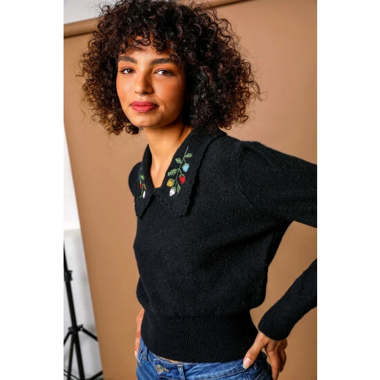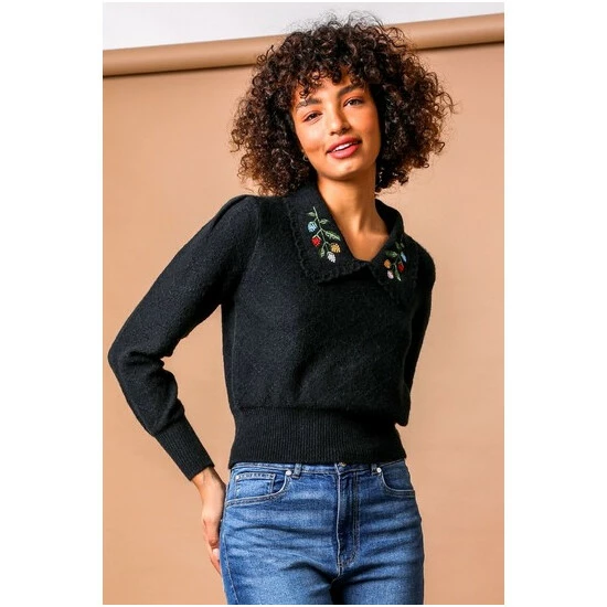 An adorable vintage inspired jumper with an oversized collar detail has just launched in our Dusk collection! Cut to a stylish cropped length with a ribbed hem and cuff, this jumper has beautiful scalloped edging around the collar. Finished with a diamond stitch texture and feminine floral embroidery, this long sleeve staple is a real winner for autumn that you can pair with jeggings for a casual look!