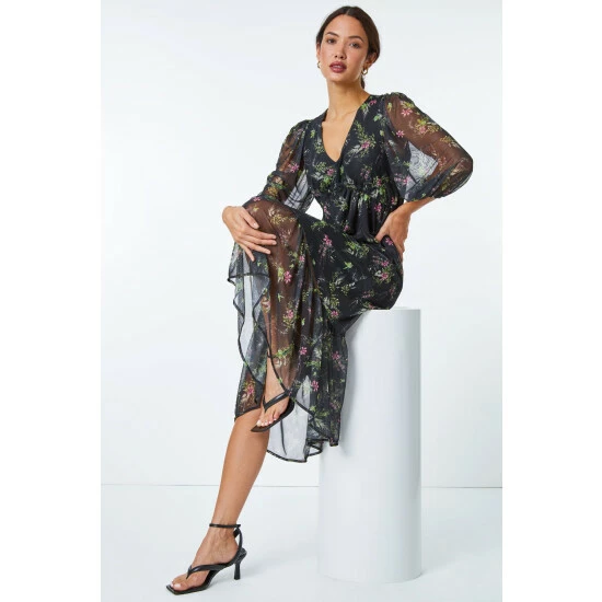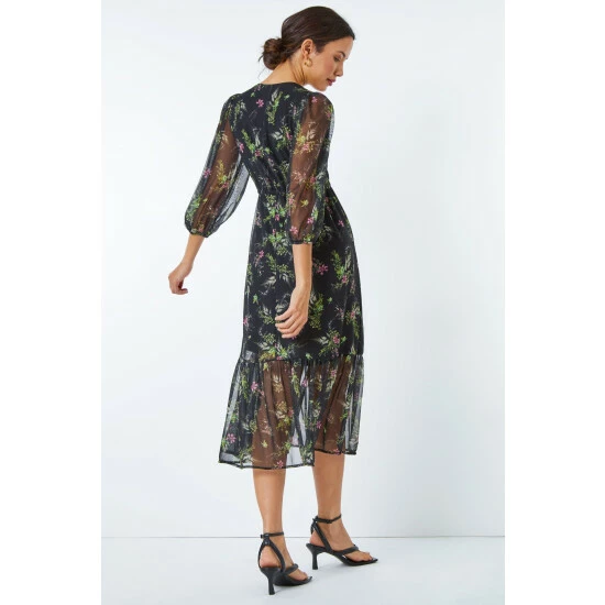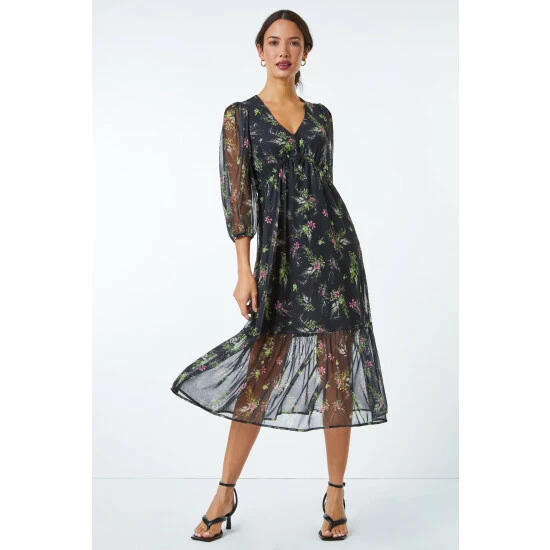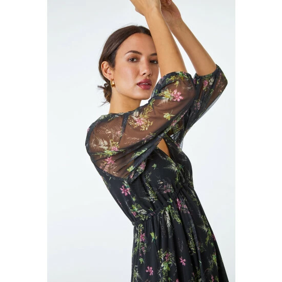 Experiment with dark, ditsy prints with this floral dress. It was made to flatter with its sleek, empire line silhouette. A v neckline adds a feminine touch and the skirt flows down to a flattering midi length. Its crafted from a printed stretch material and mesh sleeves add an interesting feature. Add sandals for sunny days or add tights, boots and a gilet for Autumn walks!