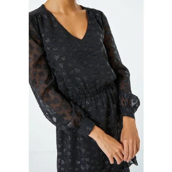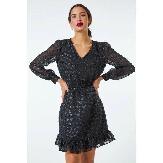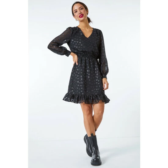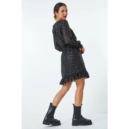 A fun love heart print meets a dark, dramatic base with this burnout mini dress. Its above the knee length and frilled hem and sleeves keep this occasion dress young and free. The burnout, print throughout and the relaxed fit will ensure both comfort and confidence. Dress up with heels or down tight and boots!