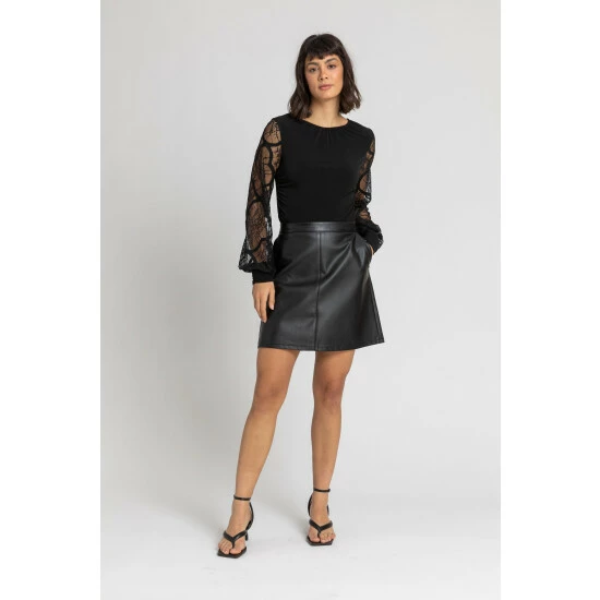 Take your style game to the next level with this stunning Dusk lace sleeve top. Featuring a jersey body with lightly draped detail and a gathered round neckline will add evening appeal to your outfit this season! The long length lace sleeves with contrast cuffs finish this silhouette. This would look great paired over faux leather leggings for a Christmas night out or with jeggings for a more casual day out.