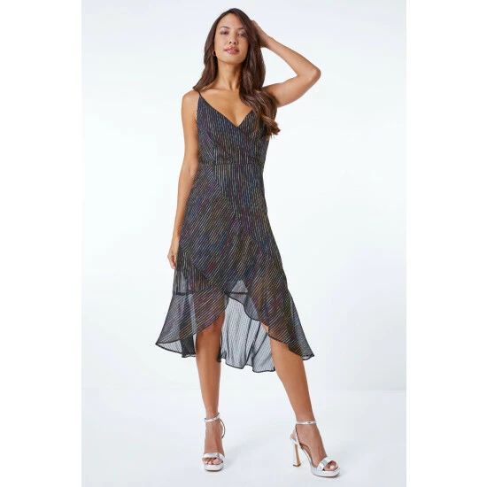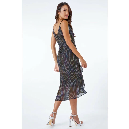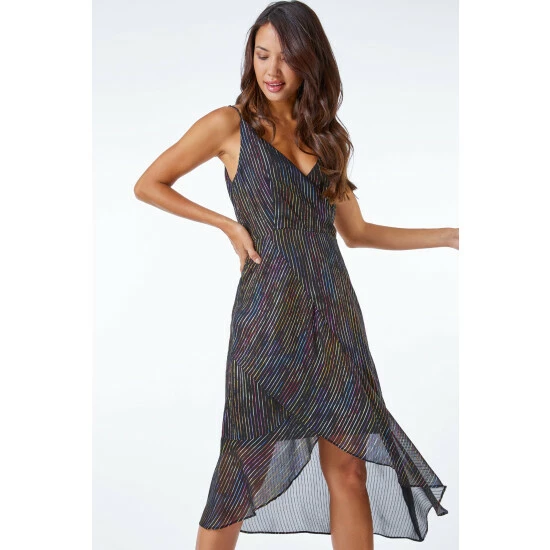 Have some fun with your occasion wear with this metallic stripe, cami dress. Cut from a smooth, woven fabric this dress is designed with a wrap bodice with a feminine v neckline and delicate cami straps. Its wrap style skirt falls to a modest midi length and is finished with soft frills along its asymmetric hem. It s adorned in a metallic stripe print that really catches the light. Add your heels and a lightweight jacket for your next event!