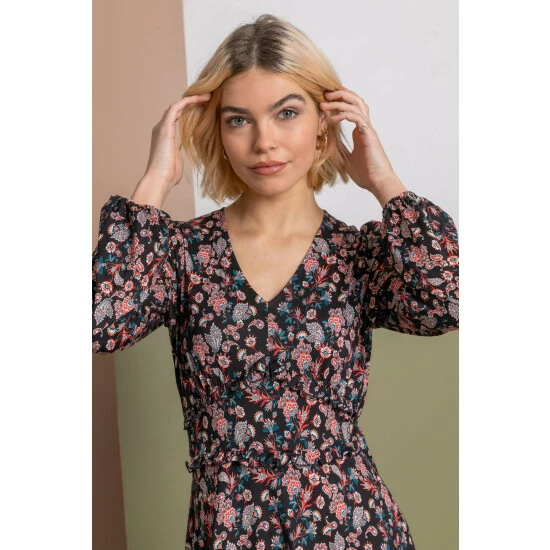 Flouncy florals for the autumn winter season, our new Dusk tea dress is a dream! Finished with feminine frill detailing on the waist and an empire line fit and flare silhouette, this little dress is perfect for any occasion. Crafted in a boho chic paisley pattern, we love to pair this long sleeve number with boots and tights in the day or dress it up with heels for a dinner date.