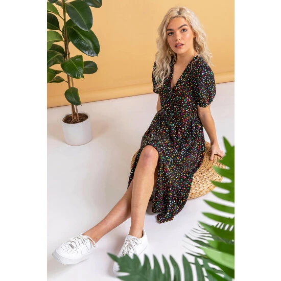 Feel free, floaty and fabulous all season long with our scattered spot print midi dress. Cut to a relaxed silhouette and fastened with a full button opening to the front with cuffed sleeves, this mid-length dress comes in an all-over bright print with a gathered waistline. Pair with your everyday trainers for a casual daytime look or dress it up with heeled sandals and a clutch for a playful evening look.