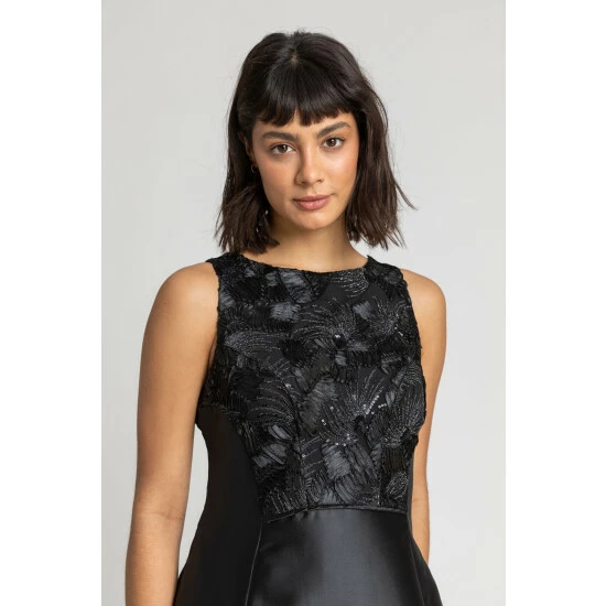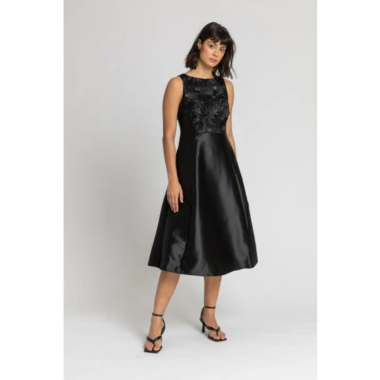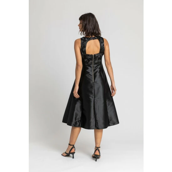 Cut a striking figure in this midi length occasion dress. The perfect party LBD, this sleeveless dress is adorned with an embellished bodice and a silky skater style skirt to add drama to your evening look. Just add silver accessories for your next special occasion, whether it be the Captain s cruise ship or a formal evening ceremony!
