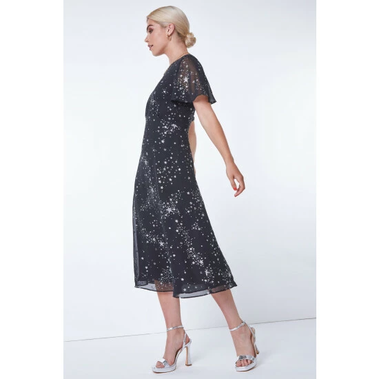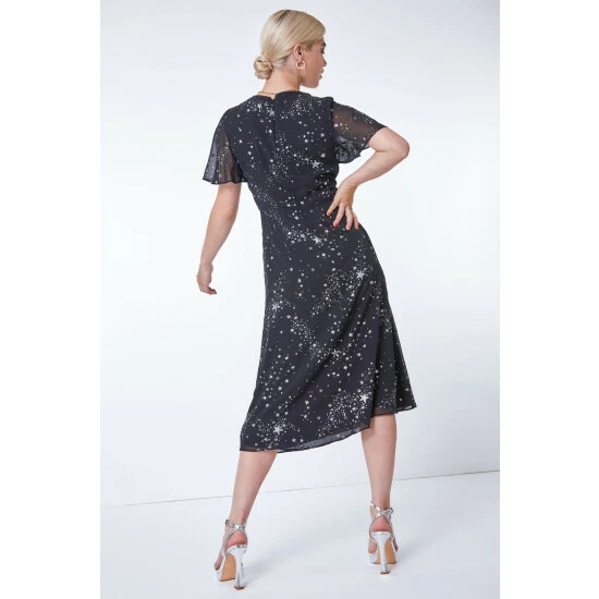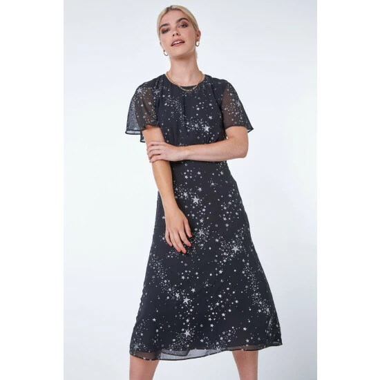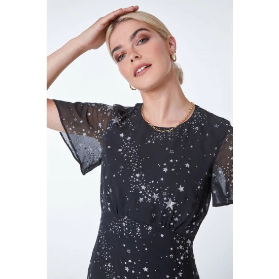 The ultimate print for the festive season, this midi length dress is adorned all over with metallic stars and plenty of shimmer. Designed with a flattering empire waistline and delicate sheer, chiffon sleeves, this is both feminine and fun. It’s cut from a woven, chiffon fabric with a flattering round neckline. Pair this with sparkling accessories to complete your party ready look!