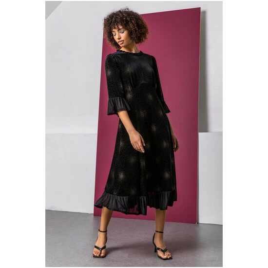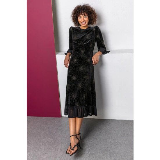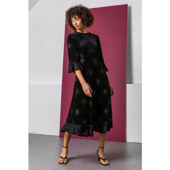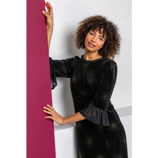 Embellished with sparkling diamante detail and shimmering firework bursts, this keyhole detail dress is a party season staple. This 3/4 sleeve style falls at a flattering midi length and has a luxe velvet finish that is so soft on the skin. The frill detail on the neckline and cuffs add a unique feminine twist to the garment that will be sure to elevate your eveningwear. Complete the look with silver jewellery and a sparkly clutch bag for your next party night!