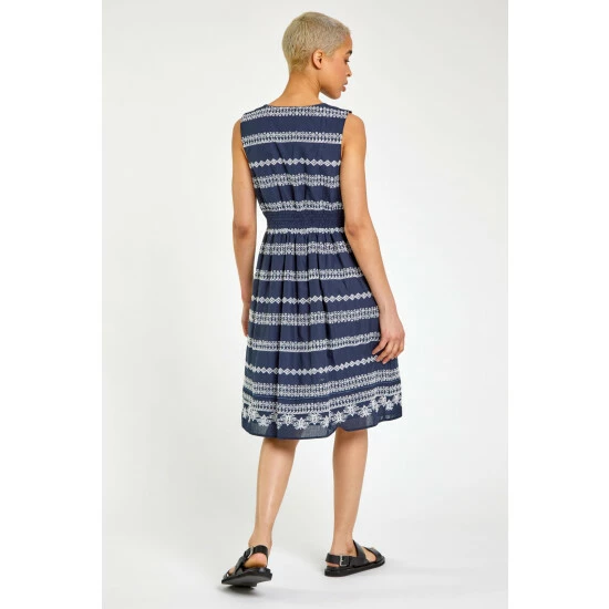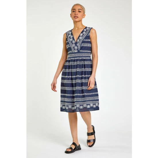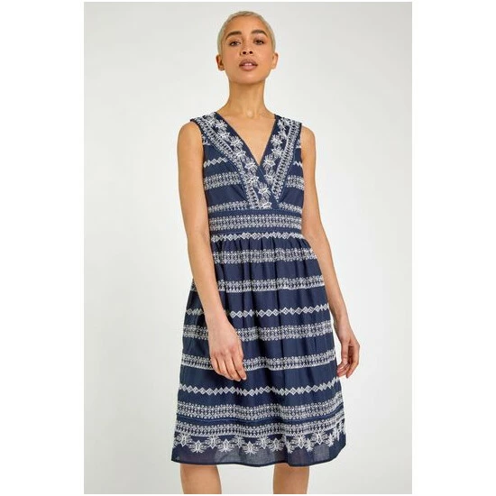 Embrace your bohemian vibes through spring summer with our cotton fit and flare day dress. Fashioned from a scandi-style broderie material, our mock wrap front creates a flattering v-neckline and cinches you in at the waist to give a feminine silhouette. Finished with a delicate detail to the trims, this fully lined piece is perfect addition in your suitcase this season. Add sandals and a denim jacket for a holiday look to take you from beach to bar in seconds.