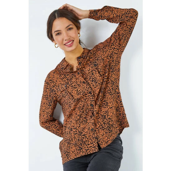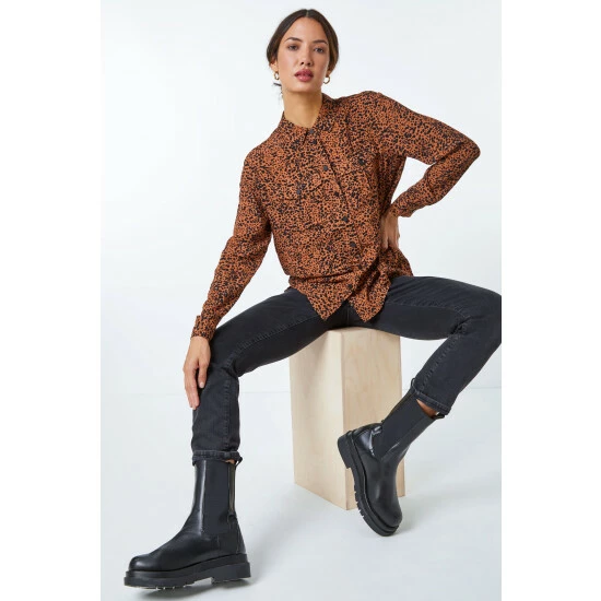 Succumb to the animal trend with this classic pocket shirt. Cut from a printed, woven, fabric in a relaxed, over shirt fit, this top offers versatility and style. Collar and sleeve button details add an important element. This would look great with smart separates for work or jeans and boots for a weekend vibe!