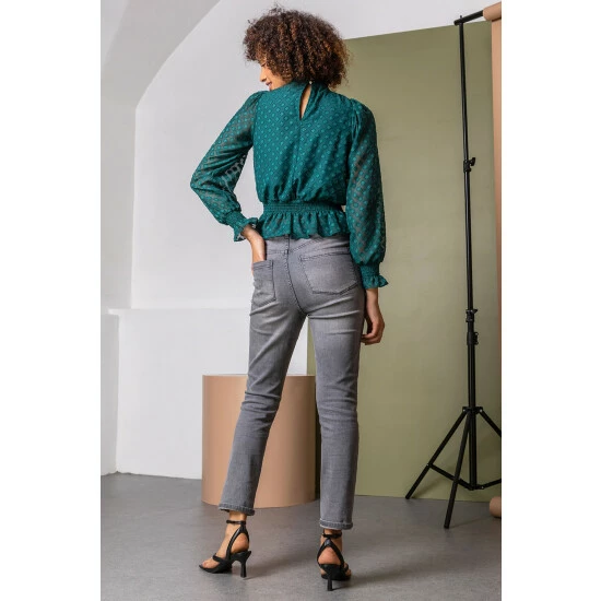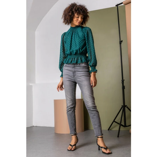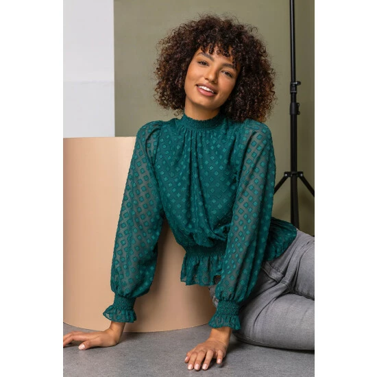 Ooze elegance and sophistication in jewel tones and period-inspired silhouettes with a trendy Roman twist. Made with an elegant high neck and all over diamond embellishment, this gathered long-sleeve number has shirring detail to cuffs and a peplum style hemline that flares out at the waist. Add a pencil skirt and heels to turn heads in the office or dress down with jeans and pumps for a casual everyday look.