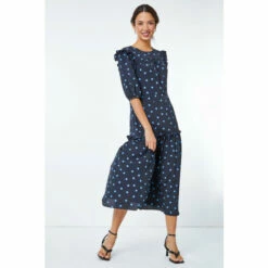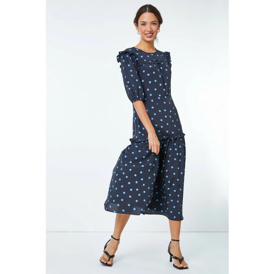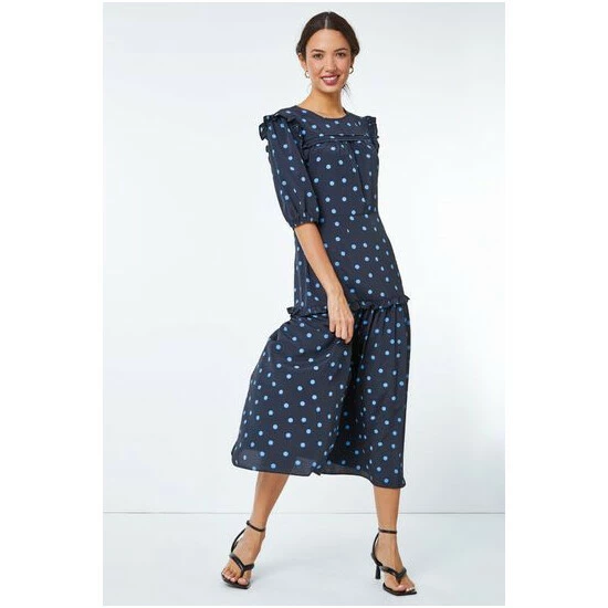 Our tiered maxi dress features an elegant neckline and dainty spot print. It comes in a flattering fit and flare shape with a swishy tiered hem that falls to your feet. The short puff sleeves have elasticated cuffs to create extra volume and are met by fluttery frills at the shoulder. We’ll be wearing this with sandals and trainers throughout the season.