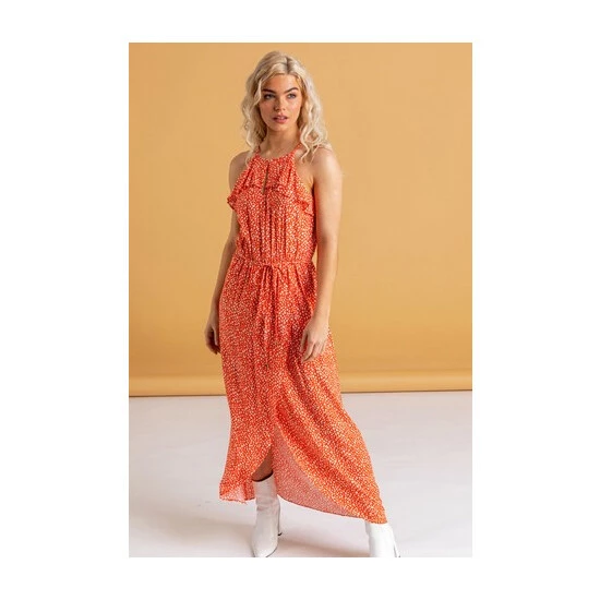 Charming and romantic, our woven maxi dress is the piece you need for the summer ahead. Our new addition is embellished by a keyhole neckline that cascades into a frill hem with a keyhole detail at the front and back. The floaty silhouette is cinched by a belted waist and flows down to a wrap front skirt with a high low hem. Whether paired with kitten heels for the night or sandals for the day, you’ll be a summer dream at any hour of the day.
