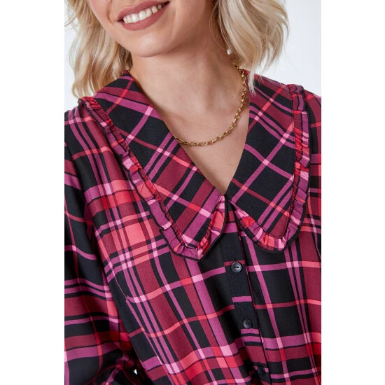 Checks are an Autumnal essential and they work perfectly on this relaxed tunic shape. Framed by full length, cuffed sleeves and a playful relaxed collar this style in fun and modern! The dropped waist and pleated frill skirt add movement and interest, insuring a flattering style. Team with tights and ankle boots for a warm and stylish look!