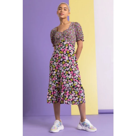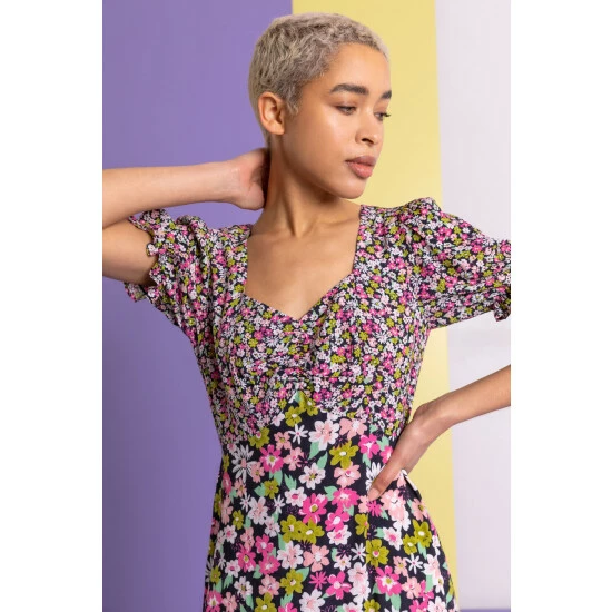 Caught in a wonderland with this contrast floral print fit and flare Dusk dress. Made to a flattering fit and flare style. The dress features a sweetheart neckline with a gathered detail on the bust, short sleeves with a elasticated cuff and frill detail. This frill hemmed number is a striking piece for your wardrobe, worn with white trainers and a side bag or paired with your favourite heels/wedges it makes for the perfect edition for a girls day out or summer garden parties this season!