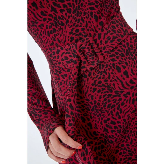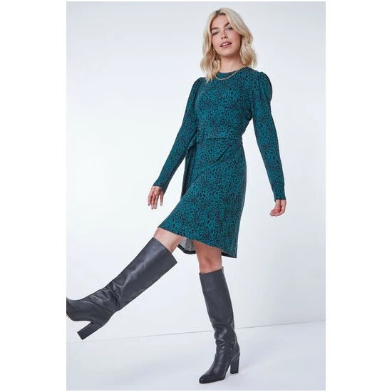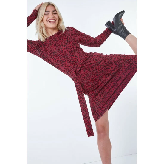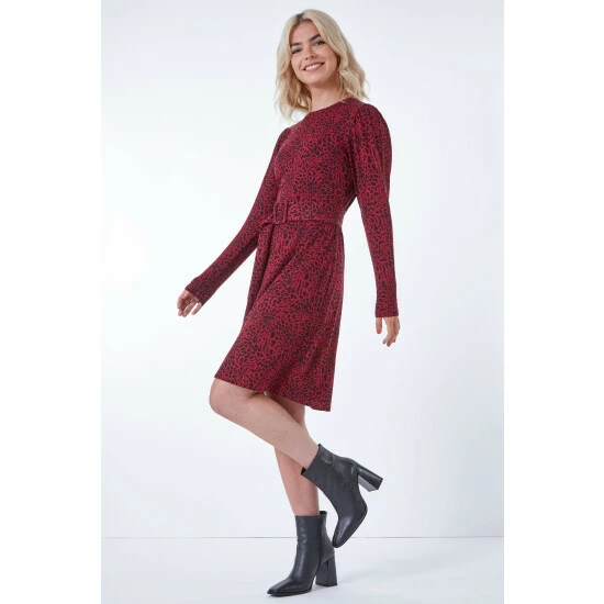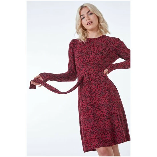 Colourful animal print is key this season and this belted, animal print, dress is the perfect way to incorporate it into your collection. Cut from a printed, stretch jersey fabric in a knee length, fit and flare style this is both playful and comfortable. It features modest full length sleeves and a round neck line. It boasts a self-fabric belt with buckle detail. Pair with tights, boots and a jacket for a day time look or swap for heels for a night out with the girls!