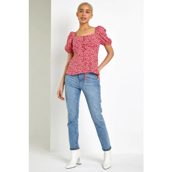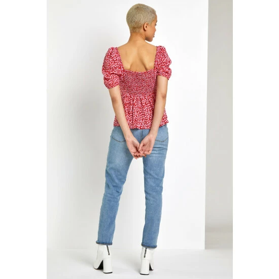 Instantly add summer vibes to your collection with this ditsy floral blouse. Cut in a feminine sweetheart neckline that ties to centre, this romantic styled number has trending puff sleeves and a shirred back to keep you comfy all day long. Gathered underbust in a peplum style, you can add wide leg or skinny jeans to create a flattering silhouette for an everyday look to take you from picnic to party!